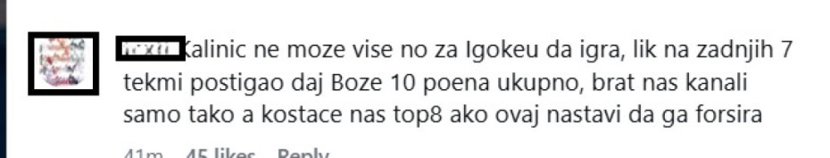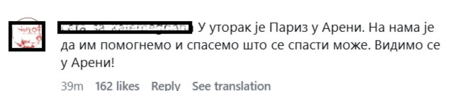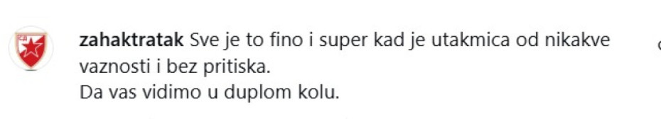 "U utorak je Pariz u Areni, na nama je da im pomognemo i spasimo što se spasti može. Vidimo se u Areni", "Pusti me ovoga, da vidimo u utorak, pa u petak", "A sada po duplu pobedu u EL i utišavanje splitskih navijača iz Beograda... Napred Zvezdo", "alinic ne moze vise no za Igokeu da igra, lik na zadnjih 7 tekmi postigao daj Boze 10 poena ukupno, brat nas kanali samo tako a kostace nas top8 ako ovaj nastavi da ga forsira", "Svaka cast na reakciji! A sada svi u Arenu na zadnju utakmicu regularnog dela... Ali vidimo se posle na još tekmi u Evroligi u Areni", "Sve je to fino i super kad je utakmica od nikakve važnosti i bez pritiska. Da vas vidimo u duplom kolu", "Bravo! A sada u seriju pobeda... Jedno 10-ak, tri Evroliga, pa plej-of, pa još dve na fajnal four", poruke su navijača Zvezde na društvenim mrežama.
