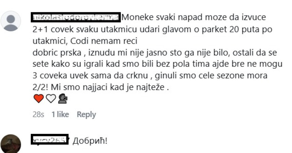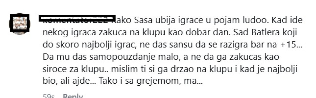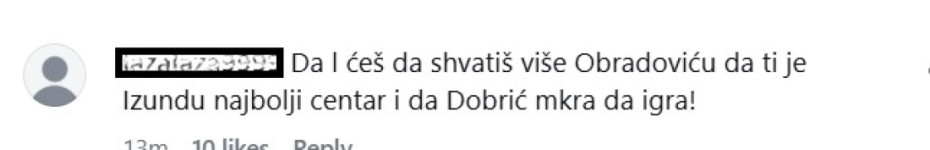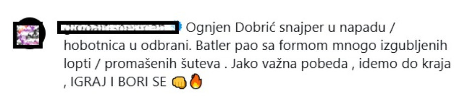 "Da li ćeš da shvatiš više Obradoviću da ti je Izundu najbolji centar i da Dobrić mora da igra!", "Kako Saša ubija igrače u pojam ludoo. Kad ide nekog igrača zakuca na klupu kao dobar dan. Sad Batlera koji do skoro najbolji igrač, ne daš šansu da se razigra bar na +15... Da mu daš samopouzdanje malo, a ne da ga zakucaš kao siroče za klupu.. Mislim ti si ga držao na klupu i kad je najbolji bio, ali ajde... Tako i sa Grejemom, ma...".