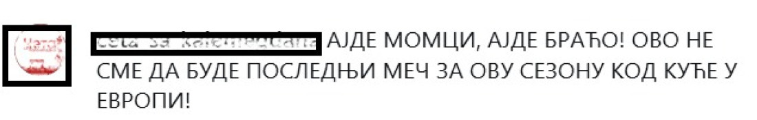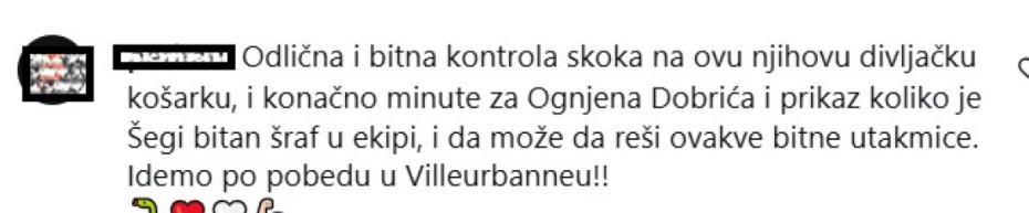 "Dobrić pa 10 mesta prazno na Nvora. Jer decko ne moe da potroši lopti i promaši zicera za josdve2 sezone koliko to moze Džordan", "Ognjen Dobrić snajper u napadu / hobotnica u odbrani. Batler pao sa formom mnogo izgubljenih lopti / promašenih šuteva . Jako važna pobeda , idemo do kraja , IGRAJ I BORI SE"", "Odlična i bitna kontrola skoka na ovu njihovu divljačku košarku, i konačno minute za Ognjena Dobrića i prikaz koliko je Šegi bitan šraf u ekipi, i da može da reši ovakve bitne utakmice. Idemo po pobedu u Villeurbanneu!!", "Moneke svaki napad može da izvuče 2+1 čovek svaku utakmicu udari glavom o parket 20 puta po utakmici, Kodi nemam reči, Dobrić prska, Iznudu mi nije jasno što ga nije bilo, ostali da se sete kako su igrali kad smo bili bez pola tima, ajde bre ne mogu tri čoveka uvek sama da crknu, ginuli smo cele sezone mora 2/2! Mi smo najjaci kad je najteže", samo su neki komentari navijača Zvezde na društvenim mrežama.