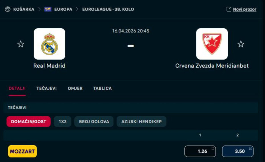Zbog svega navedenog, ali i bolje pozicije na tabeli, gde Real zauzima treće mesto sa skorom 23-14, kladionice daju jasnu prednost domaćinu. Kvota na pobedu madridskog tima iznosi 1,26, dok je trijumf Crvene zvezde procenjen znatno višim koeficijentom od 3,50.