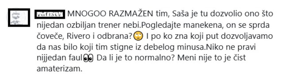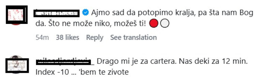 "Batler +16 sa njim na parketu… Čovek igrao sa 15%", "Ajmo sad da potopimo kralja, pa šta nam Bog da. Što ne može niko, možeš ti!", "Drago mi je za Kartera. Nas Deki za 12 min. Index -10 ... 'bem te živote", "Prelepo je videti Kartera, samo da dobije još samopouzdanja. I Čima da bude zdrav za Real","Sada da skinemo krunu kralju", "Drago mi je zbog poena Kartera...Nadam se da ce se i njemu podici samopouzdanje na viši nivo", "Mnogo razmađen tim, Saša je tu dozvolio ono što nijedan ozbiljan trener nebi.Pogledajte manekena, on se sprda čoveče, Rivero i odbrana?🙄 I po ko zna koji put dozvoljavamo da nas bilo koji tim stigne iz debelog minusa.Niko ne pravi nijjedan fau. Da li je to normalno? Meni nije to je čist amaterizam", komentari su navijača Zvezde na društvenim mrežama.