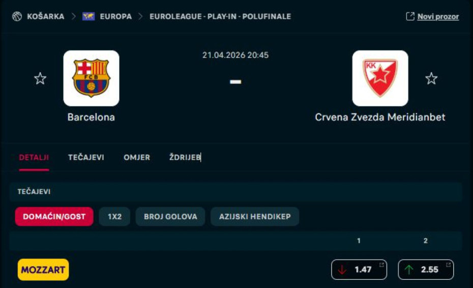 Ipak, bukmejkeri ne veruju previše bivšem šampionu Srbije i regiona pred gostovanje u španskoj prestonici. Kvota na pobedu gostiju iznosi 2,55 i u stalnom je porastu, dok je koeficijent na trijumf domaćina znatno niži i iznosi 1,47.
