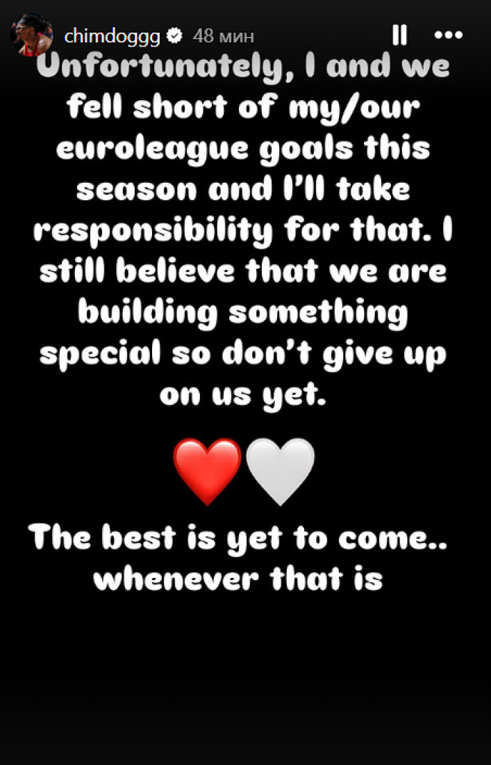 "Nažalost, ja i moj tim nismo ostvarili naše ciljeve u Evroligi ove sezone i preuzimam odgovornost za to. I dalje verujem da gradimo nešto posebno, zato nemojte još da odustajete od nas. Najbolje tek dolazi. kad god to bilo."