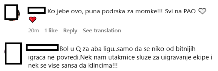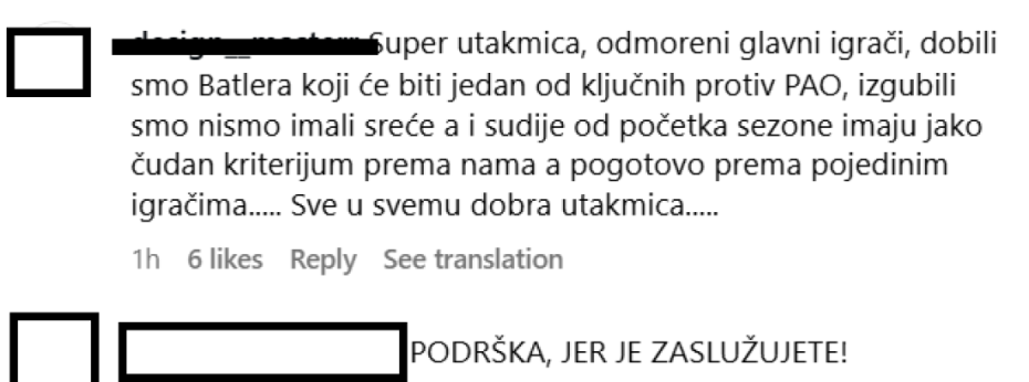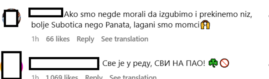 "Ako smo negde morali da izgubimo i prekinemo niz, bolje Subotica nego Panata, lagani smo momci", "Super utakmica, odmoreni glavni igrači, dobili smo Batlera koji će biti jedan od ključnih protiv PAO, izgubili smo nismo imali sreće a i sudije od početka sezone imaju jako čudan kriterijum prema nama a pogotovo prema pojedinim igračima..... Sve u svemu dobra utakmica.....", "Svaka čast Spartaku ove sezone. Igraju odličnu košarku, imaju karakter i ne odustaju i ne respektuju nikoga", "Nema veze gazimo Panatu", "Lagano, samo da se vrati Nvora i da pobedimo panatu","Koga bole... Kodi i Moneke odmorili, Batler se polako uveo... Kada ovde bude bitno igraće svi, sada se pobede u EL skupljaju", komentari su navijača na Instagram profilu.