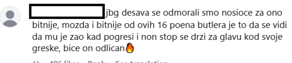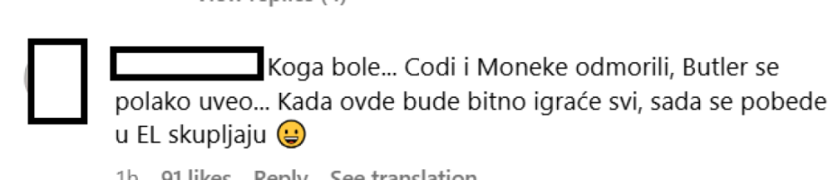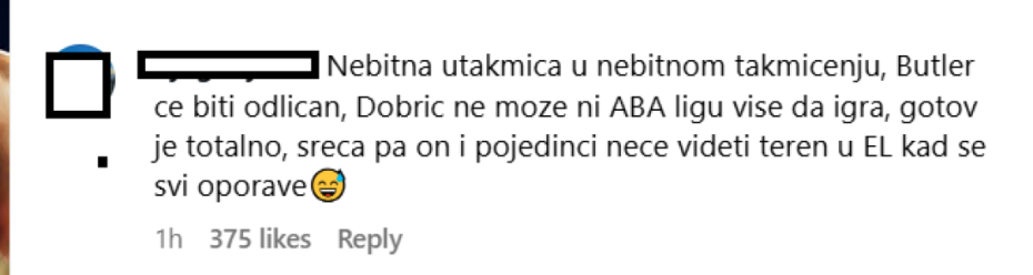 "Jbg dešava se, odmorali smo nosioce za ono bitnije, možda i bitnije od ovih 16 poena Batlera je to da se vidi da mu je žao kad pogreši i non stop se dri za glavu kod svoje greške, biće on odličan", "Nebitna utakmica u nebitnom takmičenju, Batler će biti odličan, Dobrić ne može ni ABA ligu više da igra, gotov je totalno, sreća pa on i pojedinci neće videti teren u EL kad se svi oporave".