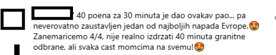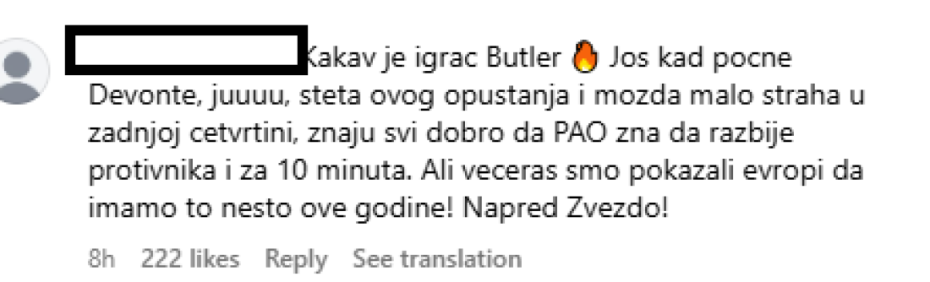Zgazi ih sveeee", "Zvezda prva na tabeli, kako ću da spavam", "Napokon imamo ekipu gde svako zna svoj posao... a odbrana klasika... granitna", "Batler je tata, čovek igra toliko slobodno i mirno, prelepi za gledati, bravo momci", "Sasvim korektno gaženje Atamana", "40 poena za 30 minuta je dao ovakav pao... pa neverovatno zaustavljen jedan od najboljih napada Evrope Zanemaricemo 4/4, nije realno izdrzati 40 minuta granitne odbrane, ali svaka čast momcima na svemu!", "Kakav je igrač Batler, još kad počne Devonte, juuuu, šteta ovog opuštanja i možda malo straha u zadnjoj četvrtini, znaju svi dobro da PAO zna da razbije protivnika i za 10 minuta. Ali večeras smo pokazali evropi da imamo to nesto ove godine! Napred Zvezdo!, samo su neki komentari navijača Zvezde na društvenim mrežama.