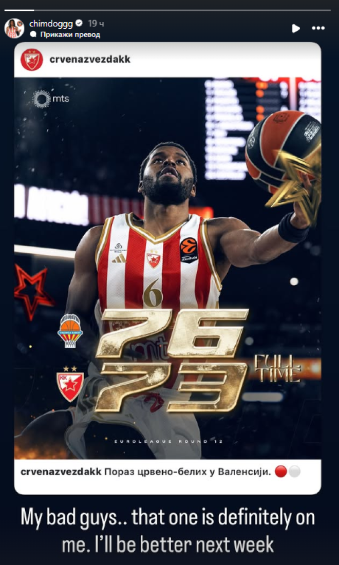 Jedan od najlošijih pojedinaca u timu bio je povratnik nakon povrede Čima Moneke, koji se vratio na teren posle pauze izazvane problemom pred duel u Dubaiju i izostanka sa utakmica protiv Monaka i Cedevita Olimpije.