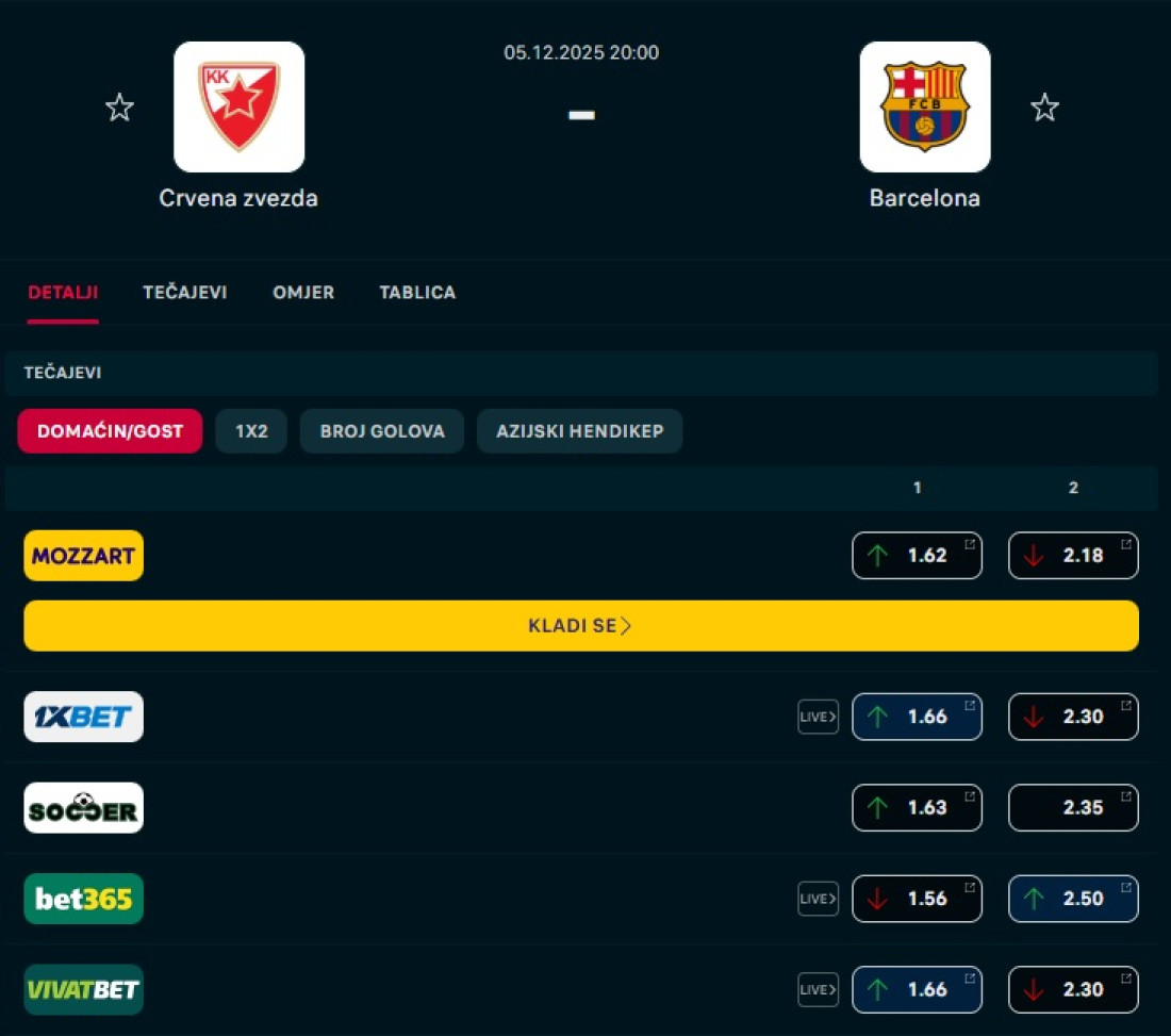 Toga su svesni i bukmejkeri, koji vide Zvezdu kao favorita u ovom duelu. Kvota na pobedu srpskog kluba kreće se od 1,56 do 1,66, dok je na trijumf Barselone od 2,18 do 2,50.