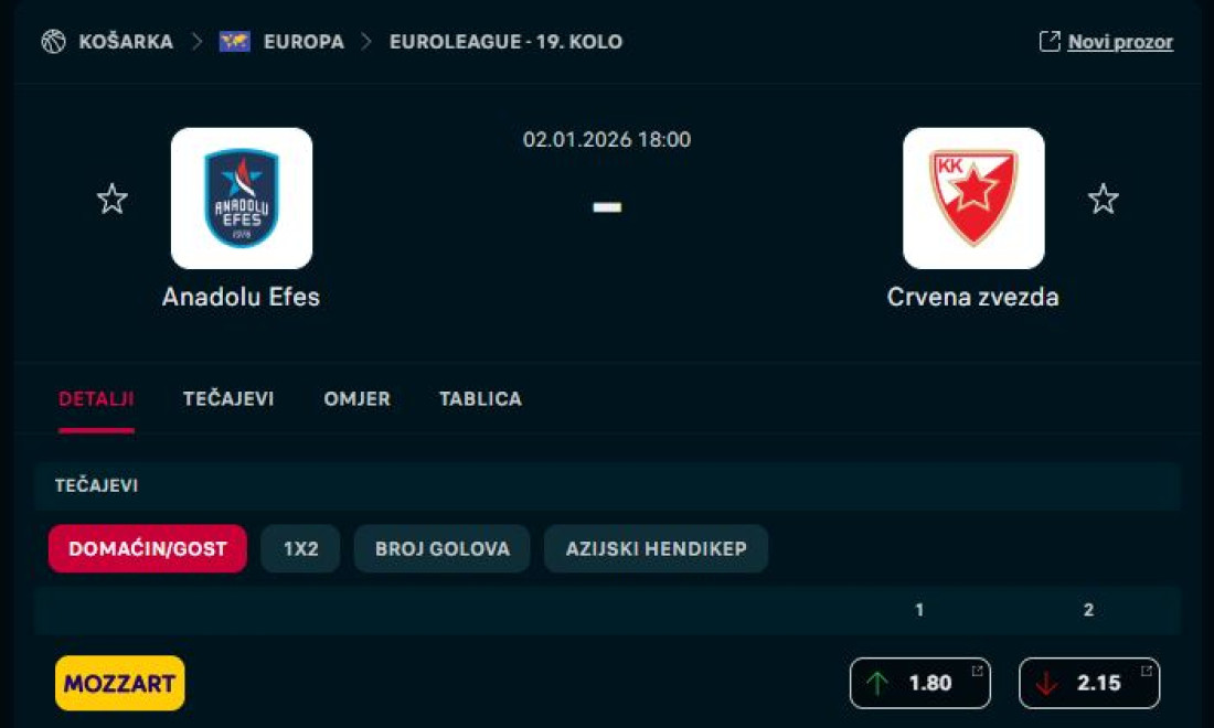 Večeras su na programu prve utakmice elitnog evropskog takmičenja u novoj, 2026. godini, a program od 18.00 časova (Arena premijum 1) otvaraju upravo srpski i turski tim. Za crveno-bele, susret u Istanbulu predstavlja svojevrsnu priliku da poprave utisak i bodovni saldo, posebno nakon četiri poraza u poslednjih pet mečeva Evrolige, ali kladionice nisu preterano optimistične po tom pitanju.