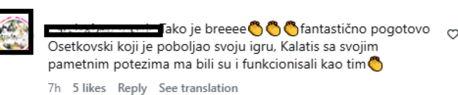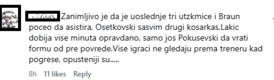 "Tako je breeee... Fantastično pogotovo Osetkovski koji je poboljao svoju igru, Kalatis sa svojim pametnim potezima ma bili su i funkcionisali kao tim", "Bravo momci", "Pobeda od više od 8 razlike nad Dubaijem naredne nedelje nam otvara vrata finala ABA lige, jer u tom slučaju sa Arapima i ciganima ne bi mogli da se sretnemo pre finala. BRAVO ZA OVO VEČERAS!", "Zanimljivo je da je uoslednje tri utzkmice i Braun počeo da asistira, Osetkovski sasvim drugi kosarkaš, Lakić dobija više minuta opravdano, samo još Pokuševski da vrati formu od pre povrede. Više igrači ne gledaju prema treneru kad pogreše, opušteniji su....." "Džekiri kao da ima 20 godina", "Digao se motiv, borba i požrtvovanje, kad već nema previše kvaliteta, za to svaka čast", "Napokon se budimo, čim smo Tajrika i Vašingtona i Džabarija sklonili, odmah igramo bolje", "Bez uvrede za Radanova ali ako ti vec fale domaći igrači zar ti nije palo napamet da dovedeš Uroša Trifunovića", samo su neki komentari navijača na društvenim mrežama.
