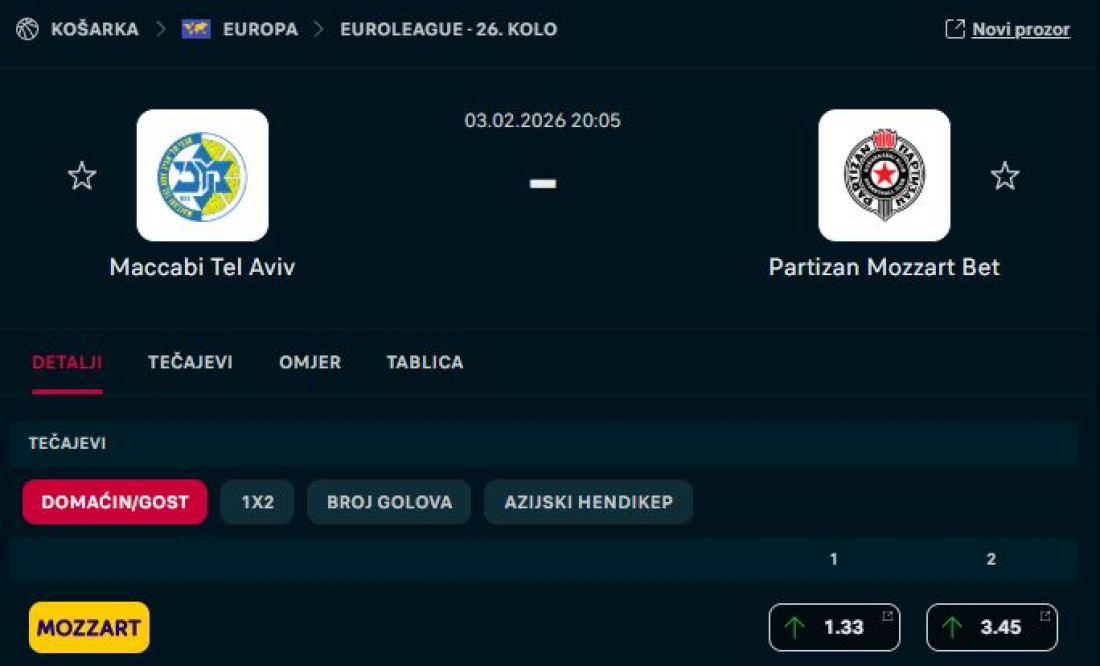 Makabi je pre tri dana poražen na gostovanju Valensiji (94:83), ali je, za razliku od narednog rivala, u nešto povoljnijoj poziciji na tabeli Evrolige. Tim Odeda Kataša trenutno zauzima 14. mesto sa učinkom od deset pobeda i 15 poraza, dok je Partizan na 18. poziciji sa skorom 8-17.
