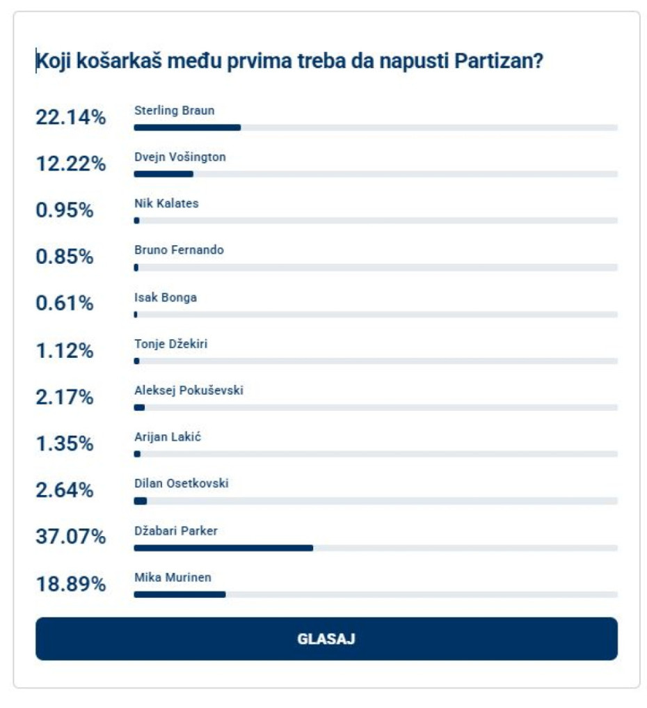 Znatno manje glasova za odlazak dobili su ostali igrači - Dilan Osetkovski (2,64%), Tonje Džekiri (1,12%), Aleksej Pokuševski (2,17%), Arijan Lakić (1,35%), Nik Kalates (0,95%), Bruno Fernando (0,85%) i Isak Bonga (0,61%).