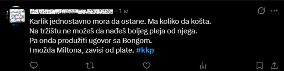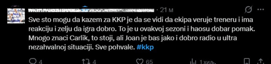 "Karlik jednostavno mora da ostane. Ma koliko da košta. Na tržištu ne možeš da nađeš boljeg pleja od njega. Pa onda produžiti ugovor sa Bongom. I možda Miltona, zavisi od plate", "Sve što mogu da kažem za KKP je da se vidi da ekipa veruje treneru i ima reakciju i želju da igra dobro. To je u ovakvoj sezoni i haosu dobar pomak. Mnogo znači Karlik, to stoji, ali Đoan je baš jako i dobro radio u ultra nezahvalnoj situaciji. Sve pohvale" , "Koliko ste me nervirali na pocetku tolikooo ste mi sad popravili veče. Bravoo bravoo", "Sutra ujutru da smo videli nov ugovor Karliku", "Bravo, odma resavajte Bongu i Karlika ugovorima", "Kako se Milton budi....Konačno, može mnogo, samo da bude rasterecen! Karlik i Bonga pišite sami cifre", komentari su navijača na društvenim mrežama X i Instagram.