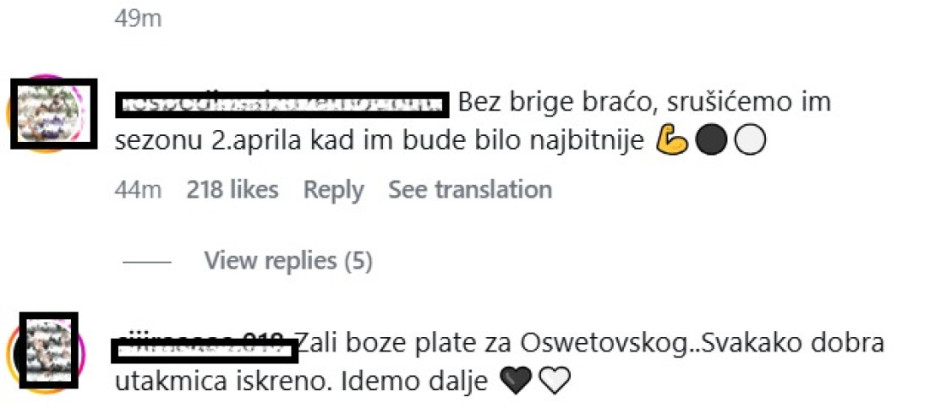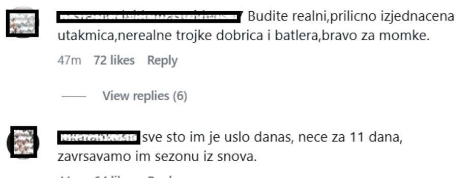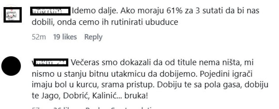 "Bez brige braćo, srušićemo im sezonu 2.aprila kad im bude bilo najbitnije", "Realno dobri ste bili usralo ih za 3", "Glavu gore momci, idemo dalje", "Osetkovski i Pokuševski ne znaju tačno koji sport igraju", "Žali Boe plate za Osetovskog. Svakako dobra utakmica iskreno. Idemo dalje", "Budite realni, prilično izjednačena utakmica, nerealne trojke Dobrića i Batlera, bravo za momke", "Sve sto im je ušlo danas, neće za 11 dana, završavamo im sezonu iz snova", Idemo dalje. Glavu gore momci","Večeras smo dokazali da od titule nema ništa, mi nismo u stanju bitnu utakmicu da dobijemo. Pojedini igrači imaju bol u kur*u, srama pristup. Dobiju te sa pola gasa, dobiju te Jago, Dobrić, Kalinić... bruka", "Realno ništa nisu bili bolji, samo su ih prosrale trojke, a nas nije htelo", poručuju navijači crno-belih na društvenim mrežama.