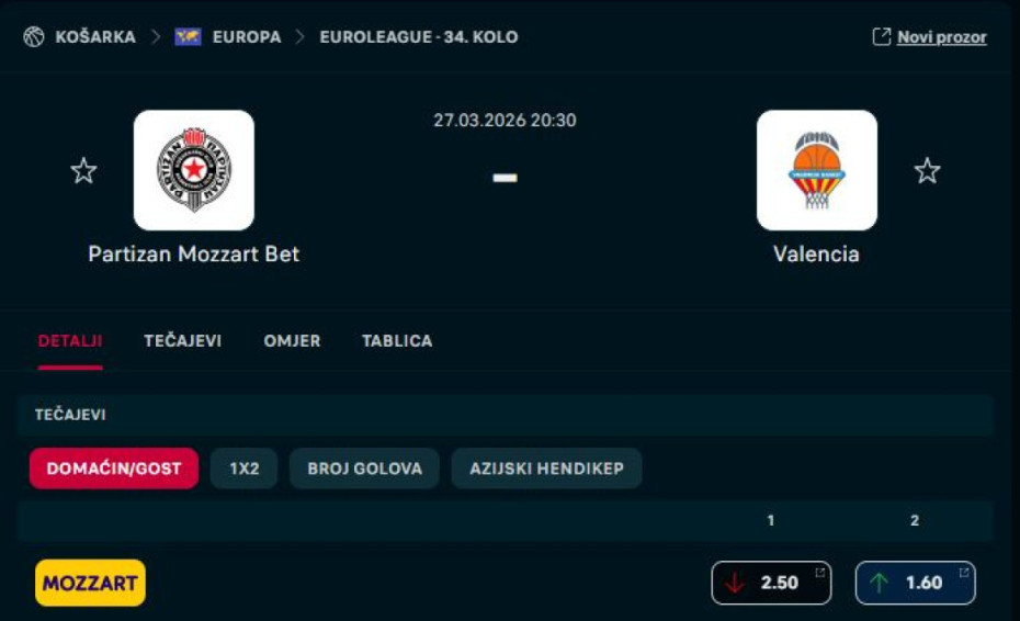 Međutim, kladionice ne vide veliku šansu za petu uzastopnu pobedu domaćeg tima u Evroligi, jer su gosti jasni favoriti. Naime, kvota za trijumf Valensije u Beogradskoj areni iznosi 1,60, dok je pobeda tima Đoana Penjaroje procenjena koeficijentom 2,50.