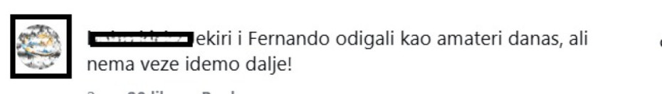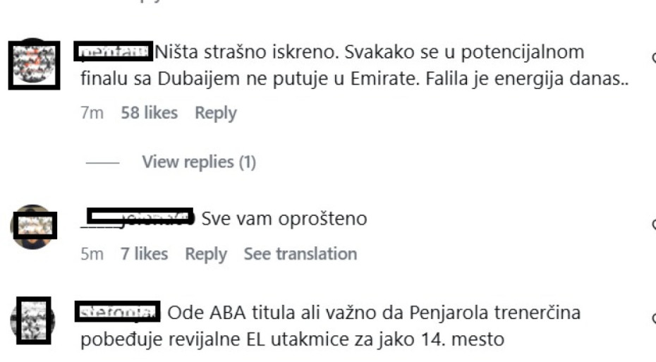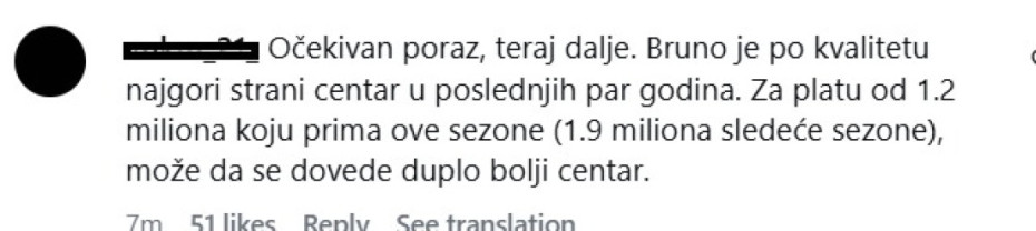 "Je l može neko da objasni Brunu i Dzekiriju da kad ih igrac obiđe nema potrebe da prave 2+1", "Džekiri i Fernando odigali kao amateri danas, ali nema veze idemo dalje!", "Teraj dalje", "Idemo dalje", "Lakši trening za milogorce u morači pred plej of", "Umor samo bravo momciii", "Stigao umor, ocekivano. Idemo dalje", "Ni jednu bitnu nije dobio...ali i dalje ima onih koji ga porede sa Žocom! Svi da odu jedan da se vrati", "Sve vam oprošteno", "Ode ABA titula ali važno da Penjarola trenerčina pobeđuje revijalne EL utakmice za jako 14. mesto", "Očekivan poraz, teraj dalje. Bruno je po kvalitetu najgori strani centar u poslednjih par godina. Za platu od 1.2 miliona koju prima ove sezone (1.9 miliona sledeće sezone), može da se dovede duplo bolji centar", "Malo pokradeni malo umor malo i oni sve pogadjali ... Idemo dalje", komentari su "grobara" na društvenim mrežama.