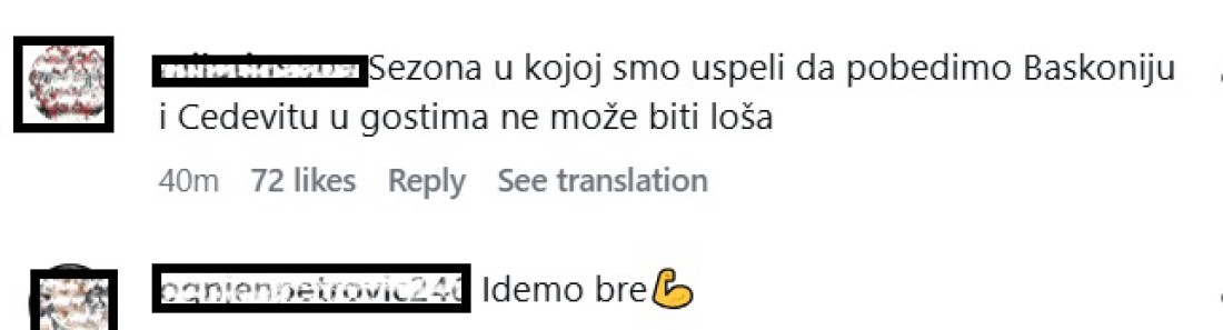 "Bravoooooo momci, definitivno fantastičan Milton i Karlik", "Beavo", "Jako bitna pobeda", "Hvala sudijama 16 37 bacanja za nas. Odlično sudđenje konačno", "Bravo bre idemo sad na cigane u aba ligi.Samo napred Partizan", "Sezona u kojoj smo uspeli da pobedimo Baskoniju i Cedevitu u gostima ne može biti loša", "Malo smo pali sa igrom", "Bruno nije igrač za Partizan dečko tezak panj", "Milton samo da aba igra!", "Bravo za Miltona!!", "Sužen nam je roster, mislim da će nam biti potreban Duane!", komentari su navijača Partizana na društvenim mrežama.