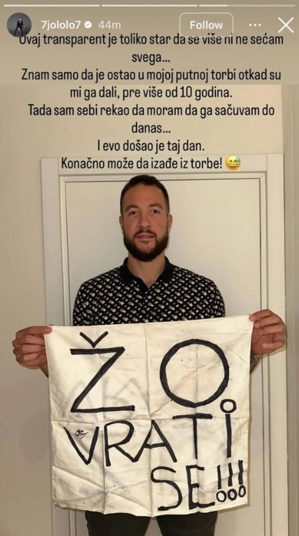 Lovernj je na društvenim mrežama podelio fotografiju transparenta sa porukom "Žo, vrati se", koji je, kako je naveo, godinama nosio sa sobom. Uz objavu je ostavio i poruku kojom je dodatno pojasnio značaj tog detalja iz prošlosti.