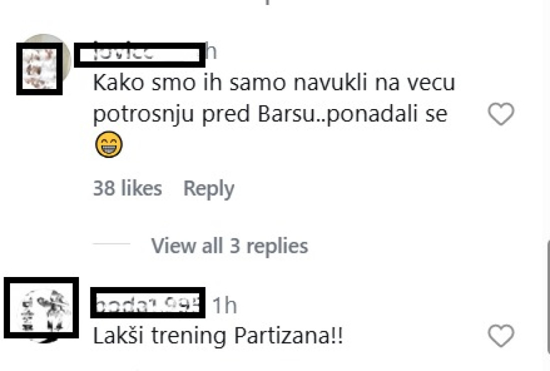 "Jedan lakši trening", "Kako smo ih samo navukli na veću potrosnju pred Barsu..ponadali se", "Ko se zadnji smeje najsladje se smeje draga komšinice", "Nikada nisam video ovoliku posećenost na treningu. Svaka čast", "Malo teži?Nije problem", "Hahahahaa ali priča kao njima je Barselona u glavi, ne znam cemu se nadaju", komentari su navijača crno-belih.