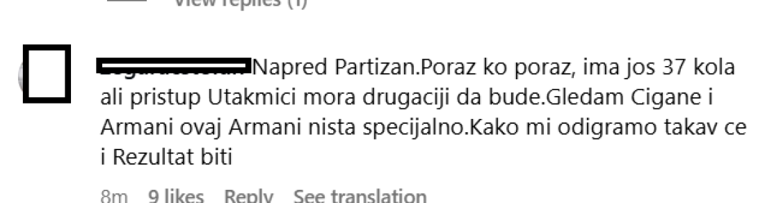 "Napred Partizan.Poraz ko poraz, ima jos 37 kola ali pristup Utakmici mora drugačiji da bude.Gledam cigane i Armani ovaj Armani nista specijalno.Kako mi odigramo takav će i rezultat biti".