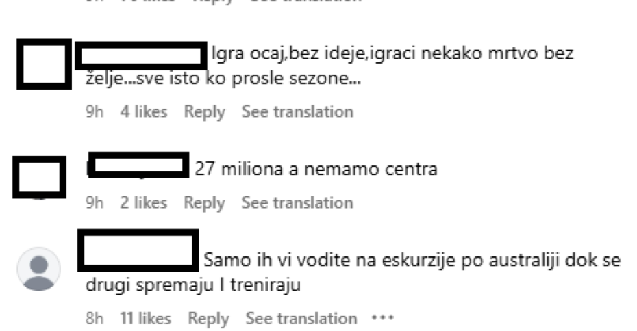 "Glupi igrači, glupe odluke, glupa igra, sve u svemu isto kao prosle sezone i tako u nedogled", "Sve isto kao prosle sezone", "Odgovornost. Kakvi smo mi umetnici, stignemo nekako 7 razlike , i povedemo i onda 4 uzasna napada bez tajmauta, forsiranje miltona preko koga smo primili 20 poena, uzasna odbrana i preuzimanja, ekipa bez zelje , pristup kao da je humanitarna utakmica. Šlag na tortu uvodđenje Pokuševskog kad je sve gotovo, da ne pominjem sedenje Džabarija celu drugu četvrtinu , Vanja je zaboravljen mučenik na klupi, jadni ovi nasi igraci. Ne znam dokle igranje sa 7 igrača i forsiranje onih kojih neće, Osetkovski odličan, al moze da igra Tajrik koji je moze da se sastavi. Bitno je da mučenim fudbalerima skidamo dres i držimo lekcije, nek se sastanu čim se vrate u Bgu i dobre razmisle šta dalje, ovo je dno dna", "Ne treba ocekivat nista od ove ekipe u sezoni", "Sramota i igrača i trenera, toliko od mene", "Jad i beda, kriminalna igra", komentari su navijača Partizana na društvenim mrežama.
