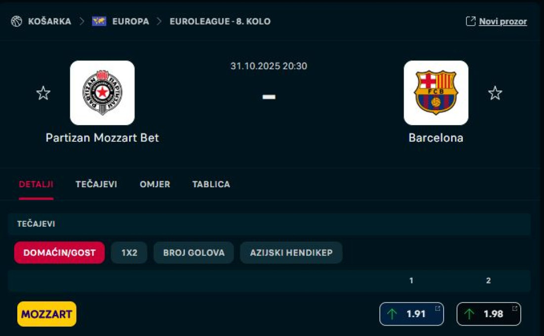Čak štaviše, slove za blagog favorita. Kvota na pobedu Partizana iznosi 1,91, dok se, s druge strane, slavlje Barselone vrednuje kvotom 1,98.