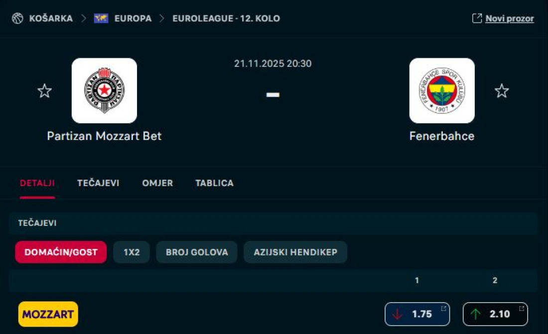 Međutim, i pored trenutnih rezultatskih oscilacija, Partizan slovi za favorita u sutrašnjem okršaju u Beogradskoj areni. Kvota na pobedu domaćina iznosi 1,75, dok je koeficijent na trijumf turskog tima 2,10.