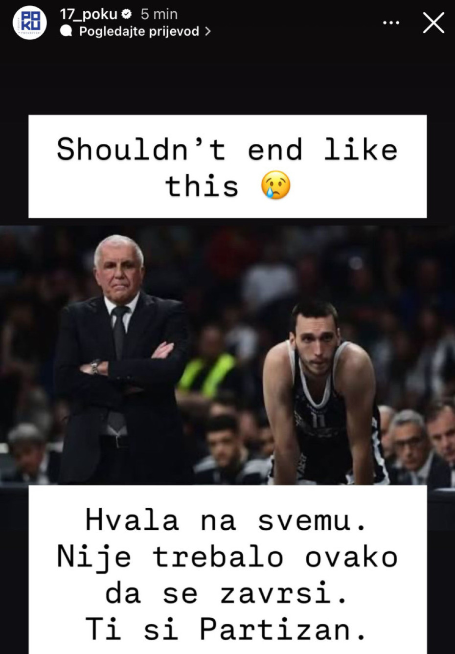 - Hvala na svemu. Nije trebalo ovako da se završi. Ti si Partizan - napisao je u objavi Pokuševski.