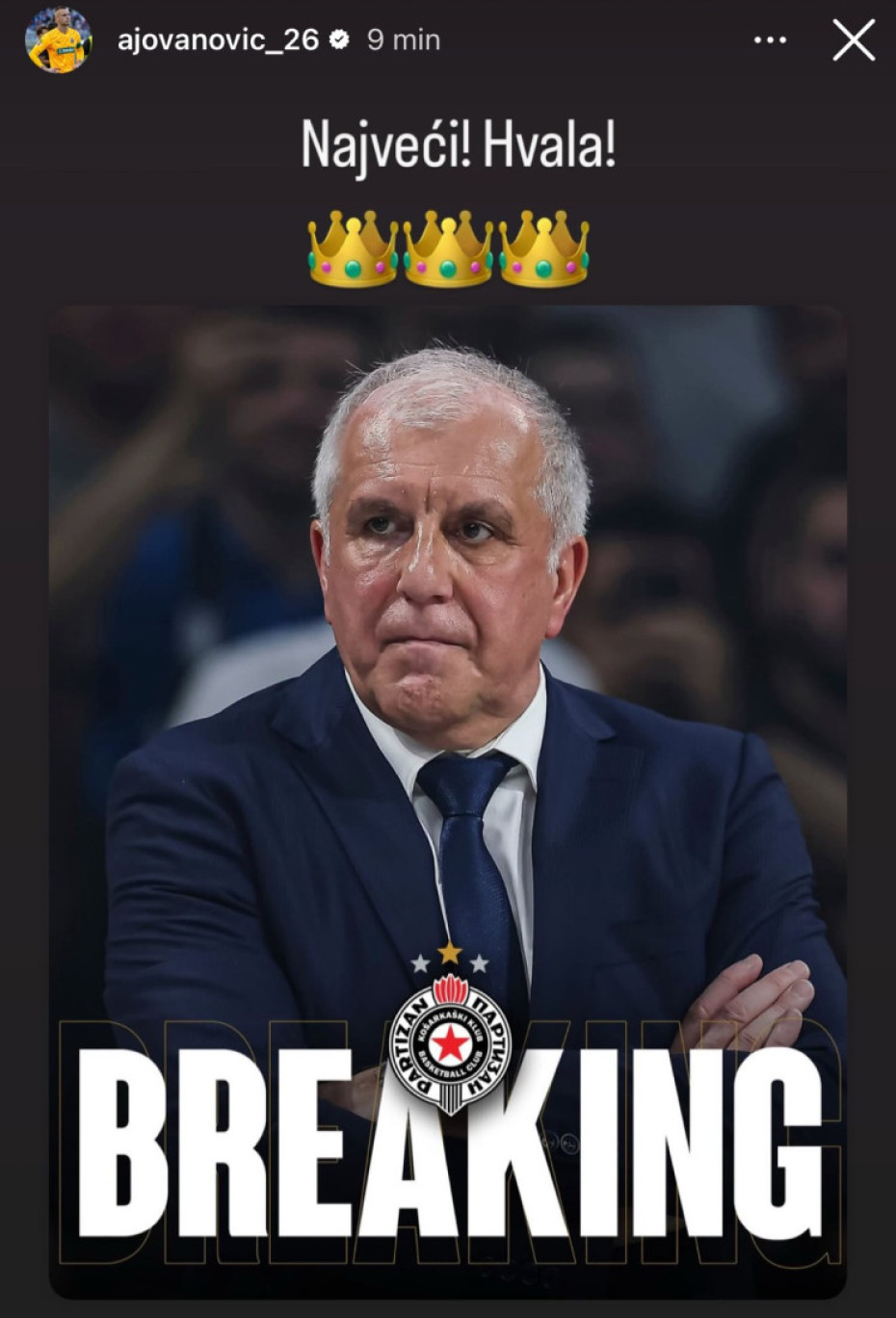 "Najveći, hvala", napisao je Jovanović uz emotikona tri krune i fotografiju doskorašnjeg trenera "parnog valjka".