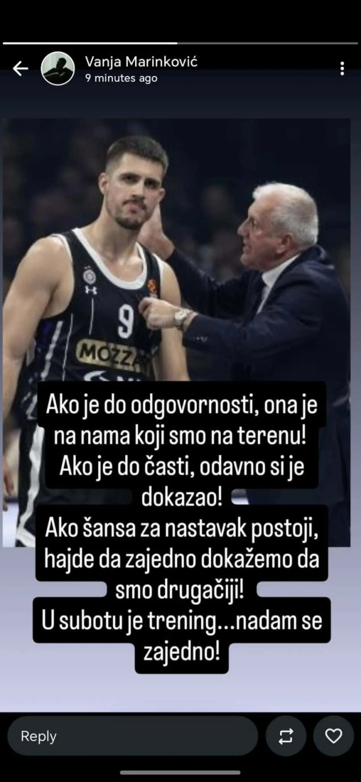 "Ako je do odgovornosti, ona je na nama koji smo na terenu! Ako je do časti, odavno si je dokazao. Ako šansa za nastavak postoji, hajde da zajedno dokažemo da smo drugačiji. U subotu je trening... Nadam se, zajedno", napisao je Vanja Marinković.