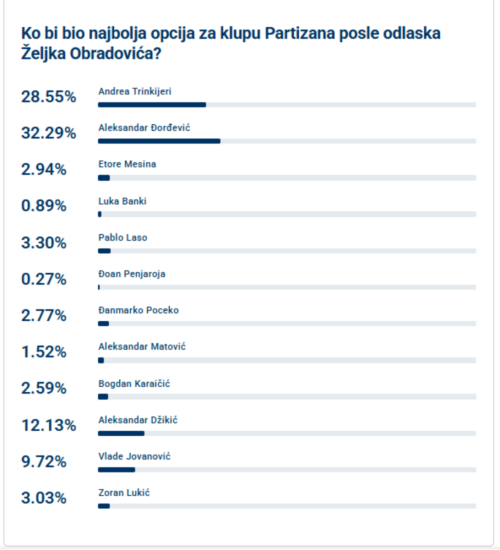 U ovom momentu je glavno pitanje ko će preuzeti crno-bele, ali nije toliko situacija bleda. Opcija ima i domaćih i stranih. Najviše glasova u anketi na našem portalu dobio je Aleksandar Đorđević, njega želi 32,29 odsto ankatiranih. Na drugom mestu je bivši trene crno-belih i ljubimac navijača Anrea Trinkijeri, za koga je glasalo 28.55 odsto ispitanika, dok je treći favirit navijača Aleksandar Džikić sa 12,13 odsto glasova.
