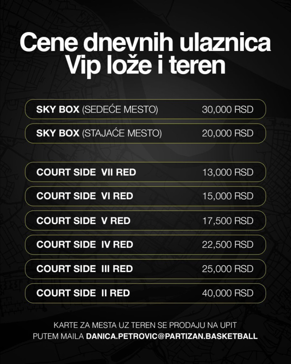 Slobodna prodaja dnevnih ulaznica za utakmicu protiv Bajerna počinje 03. decembra u 12 časova i odvijaće se putem linka na sajtu partizan.basketball, zatim sajta efinity.rs, na blagajni Beogradske arene (blagajna sever) i Efinity prodajnim mestima (Sava Centar i Dom omladine)", napisali su crno-beli.