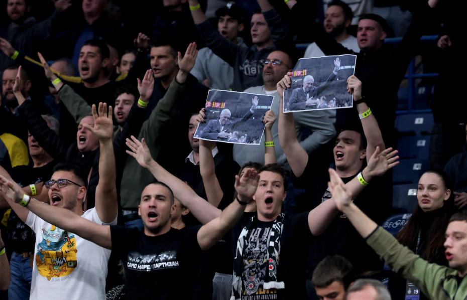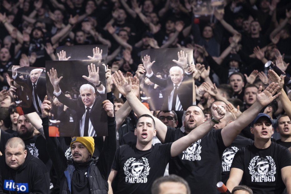 Večeras je Arena obojena u crno-bele boje, jer navijači Partizana pružaju podršku svom bivšem treneru Željku Obradoviću.