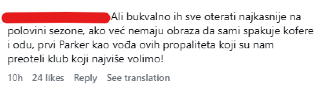 "Ali bukvalno ih sve oterati najkasnije na polovini sezone, ako već nemaju obraza da sami spakuju kofere i odu. Prvi Parker kao vođa ovih propaliteta koji su nam preoteli klub koji najviše volimo", izuzetno besan je bio jedan od navijača Partizana.