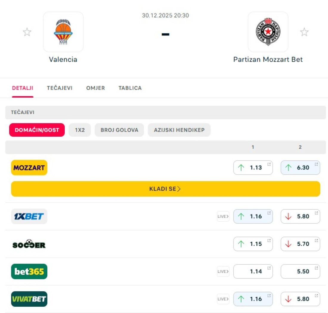 Što se međusobnih duela tiče, Valensiju nismo gledali prošle sezone u Evroligi, ali u prethodnim jesmo. U sezoni 2023/24. crno-beli su slavili u oba duela, dok su u povratničkoj sezoni Partizana u elitu "slepi miševi" slavili i prvi i drugi put.