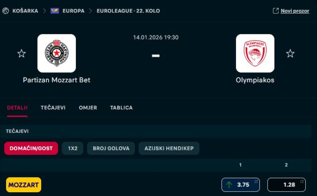 Prema preliminarnim procenama kladionica širom sveta, kvota na pobedu Partizana iznosi visokih 3,75, dok je koeficijent na trijumf gostujuće ekipe znatno niži i iznosi 1,28.