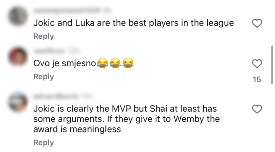 "Ameri su smešni, ovo je sramota", "Nikola Jokić je realan MVP", "Jokić je najbolji igrač u čitavoj NBA ligi", "Nikola bi trebalo da bude MVP, ako tu nagradu osvoji Vembanjama biće besmisleno", "Jokić zaslužuje ovu nagradu, kako mogu da dozvole ovu nepravdu", samo su neki od komentara nezadovoljnih navijača na društvenim mrežama.