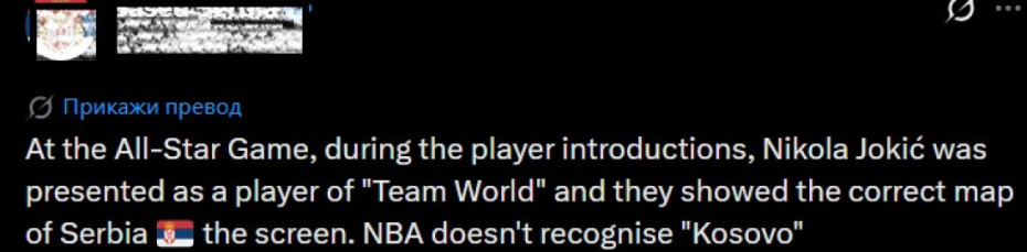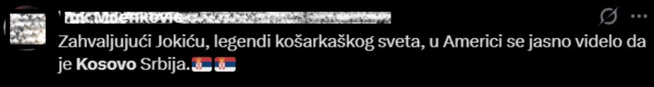 "NBA liga je pokazala pravu mapu Srbije, respekt", "NBA ne priznaje "Kosovo", "Prilikom predstavljanja Nikole Jokića pokazana je tačna mapa Srbije", "Milioni gledalaca širom sveta videli su jasno vizuelno priznanje teritorijalnog integriteta Srbije", "To je za svaku pohvalu! Respekt","Jokić i Kosmet vraća", Zahvaljujući Jokiću, legendi košarkaškog sveta, u Americi se jasno videlo da je Kosovo Srbija", samo su neki komentari na društvenim mrežama.