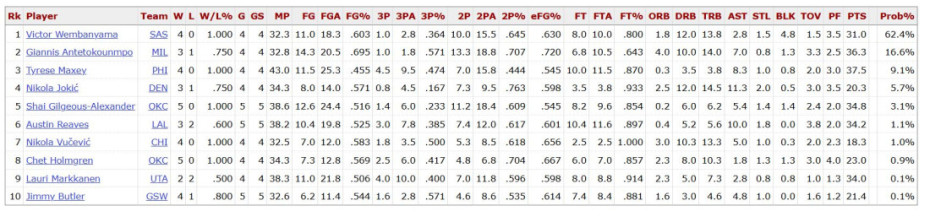 Lidersku poziciju na tabeli zauzima Viktor Vembanjama, košarkaš San Antonio Sparsa, tima koji je od početka sezone upisao pet pobeda u isto toliko odigranih utakmica.