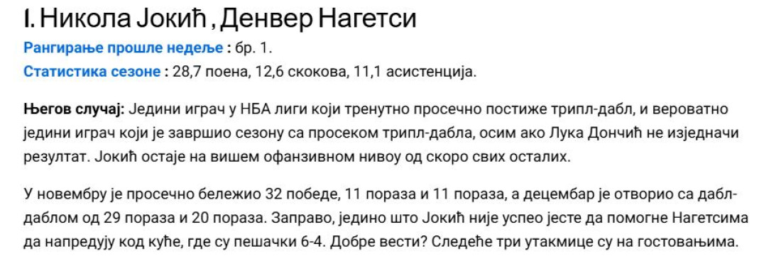 Nakon vrhunskih partija tokom ove nedelje i osvajanja nagrade za najkorisnijeg igrača Zapada u novembru, centrar Denver Nagetsa nastavio je da impresionira individualnim učinkom, zbog čega je ostao na samom vrhu ovog poretka. Korpulentni Somborac trenutno beleži prosek od 28,7 poena, 12,6 skokova i 11,1 asistenciju – što znači da je ponovo na nivou tripl-dabla.