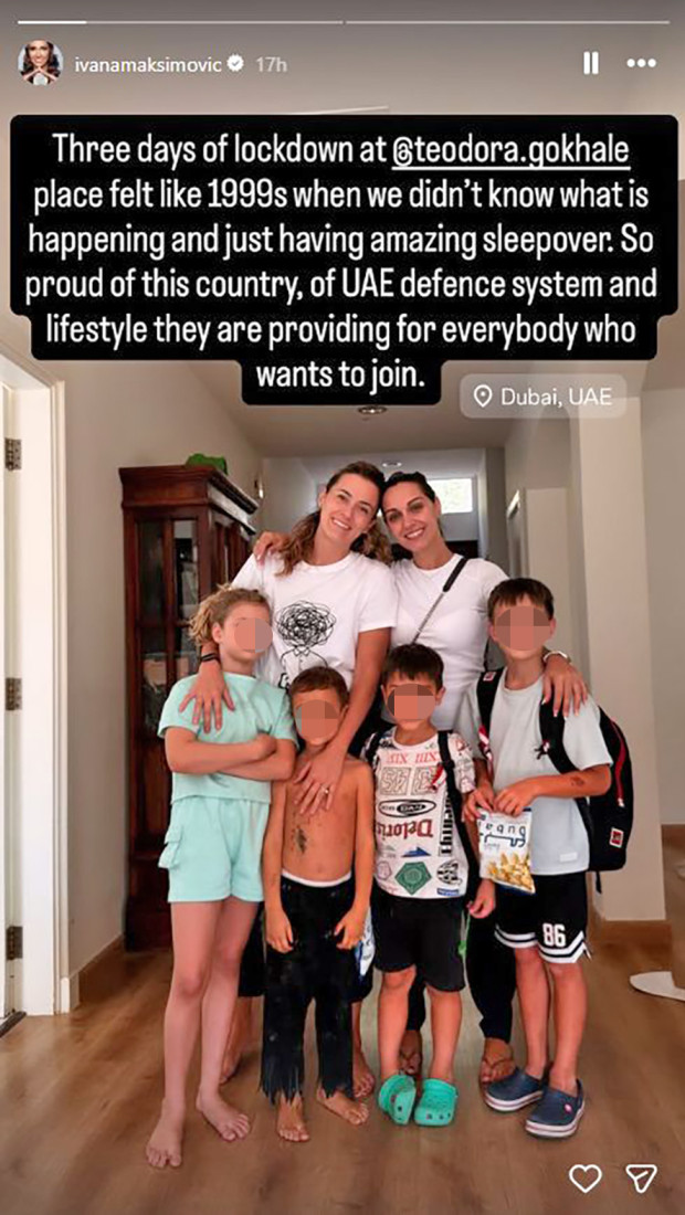 "Tri dana karantina kod Teodore u kući. Osetila sam se kao 1999. godine, kada nismo znali šta će se desiti i imali smo sjajnu žurku sa prespavanjem. Ponosna sam na ovu zemlju i odbrambeni sistem Ujedinjenih Arapskih Emirata i način života koji pružaju svima koji žele da im se pridruže", napisala je Ivana.
