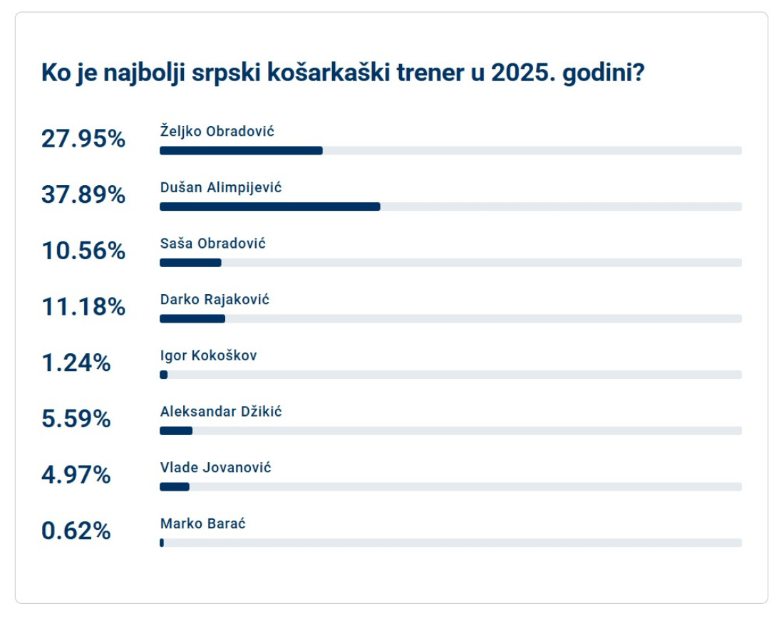 Drugo mesto u našoj anketi pripalo je doskorašnjem treneru Partizana Željku Obradoviću. Najtrofejniji evropski stručnjak dobio je 27,95 odsto glasova. Legendarni Žoc u prvom delu godine vodio je crno-bele do dve titule, u ABA ligi i Superligi Srbije. Ipak, ova 2025/26 sezona, uprkos zvučnim pojačanjima nije počela dobro za ekipu iz Humske, prvenstveno u Evropi. Ekipa je upisala brojne poraze, a uz to pojedini igrači su se ponašali neprofesionalno, pa je Obradović posle četiri i po godine odlučio da napusti crno-bele.
