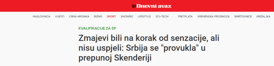"Avaz.ba" ide i korak dalje i ističe da se Srbija provukla u Skenderiji: "Zmajevi bili na korak od senzacije, ali nisu uspeli: Srbija se "provukla" u prepunoj Skenderiji", dok je naslov drugogt teksta: "Himna Srbije u Skenderiji dočekana sa zvižducima i pesmom "Srbijo, kur** balkanska".