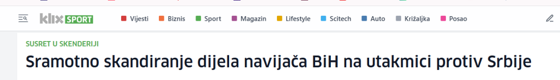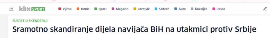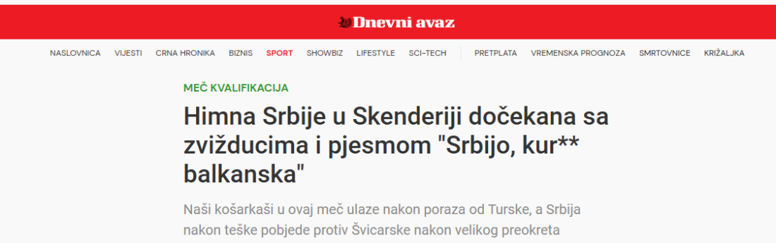"Himna Srbije "Bože pravde" u Skenderiji je dočekana uz velike zvižduke i pesmu "Srbijo, kur** balkanska". Neki su navijači i s aplauzom dočekali himnu gostiju", piše pomenuti portal bez reči osude za uvrede.