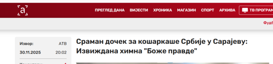 "ATV", portal iz Republike Srpske, osuđuje zvižduke za himnu Bože pravde.