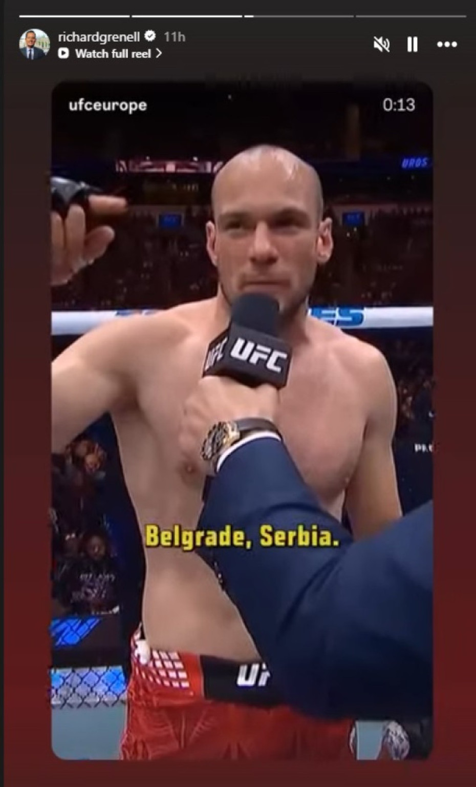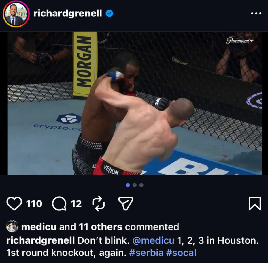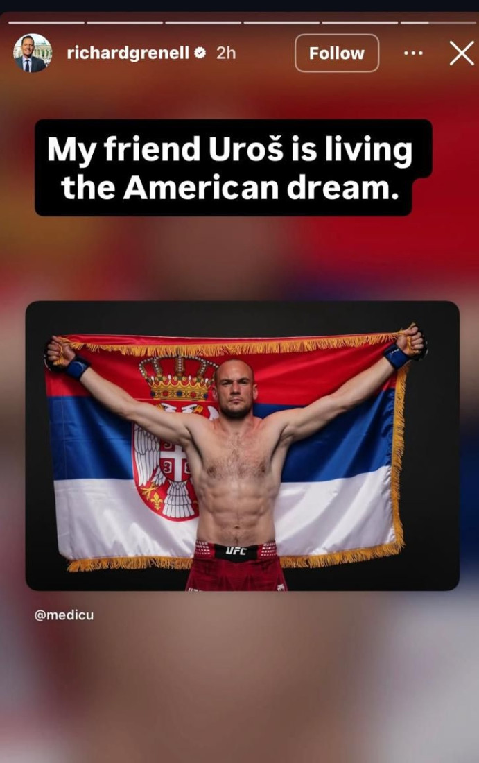 Grenel je na društvenim mrežama objavio video snimak našeg najboljeg borca Uroša Medića, koji je pre nekoliko meseci zamolio predsednika Donalda Trampa da mu pomogne da na vreme dobije vizu, kako bi došao u Beograd na spektakl i borio se pred svojim narodom. Reagovao je tada i prvi čovek UFC-a Dejna Vajt, veliki prijatelj prvog čoveka Amerike, i Medić je dobio papire.