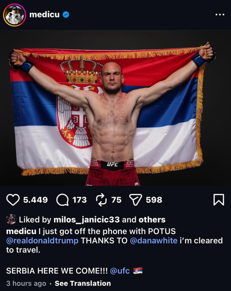 - Beograd, Srbija, UFC ovog leta, Leon Roki Edvards, ako je dostupan. Nokautiraću i njega, a zatim i sve ostale nakon toga. Imam samo jedan problem, još uvek ne mogu da putujem van Amerike i potrebna mi je pomoć. Gospodine predsedniče, ako vidite ovo, molim vas, moram ovog leta da budem u Beogradu na UFC spektaklu - poručio je Uroš Medić nakon što je pre nekoliko meseci nokautirao Amerikanca Džefa Nila.