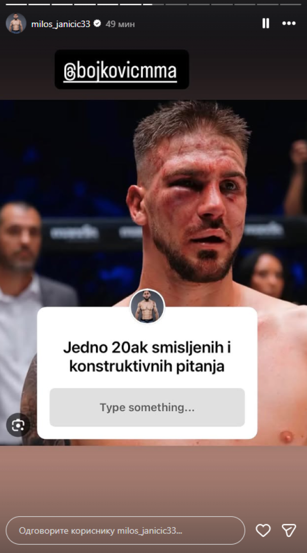 Vrlo brzo Janičić je otvorio anketu na svom "Instagramu" gde je omogućio navijačima da mu postave pitanje, a za sliku je iskoristio demolirano lice Marka Bojkovića nakon njihove borbe.