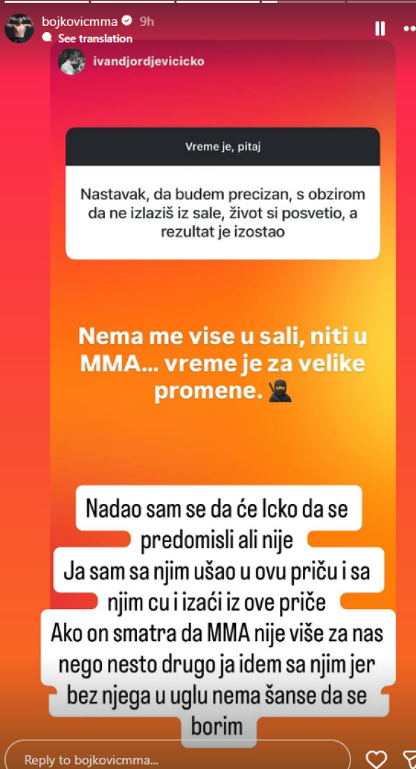 "Nadao sam se da će Icko da se predomisli, ali nije. Ja sam sa njim ušao u ovu priču i sa njim ću i izaći iz ove priče. Ako on smatra da MMA nije više za nas, nego nešto drugo, ja idem sa njim, jer bez njega u uglu nema šanse da se borim", napisao je Bojković.