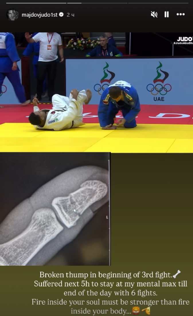 "Ovo je slika mog polomljenog palca na početku treće borbe. U bolovima narednih pet sati uspeo sam da budem na mom mentalnom maksimumu i da završim dan sa šest borbi. Vatra u vašem duhu mora biti jača od vatre u vašem telu", poručio je Majdov.